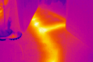 Lo que se ve en la foto es una filtración registrada bajo un piso. Se ve la matriz de calefacción, y a la derecha sale el agua, la cual en este caso estaba siendo repuesta mediante una válvula de llenado automático. La cámara termográfica es capaz de detectar el lugar exacto de la filtración, e indicar el lugar específico que se debe levantar, ahorrando grandes gastos al propietario.